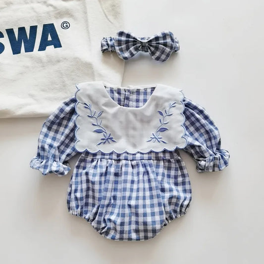 Blue & White Gingham Romper, With Bow Headband