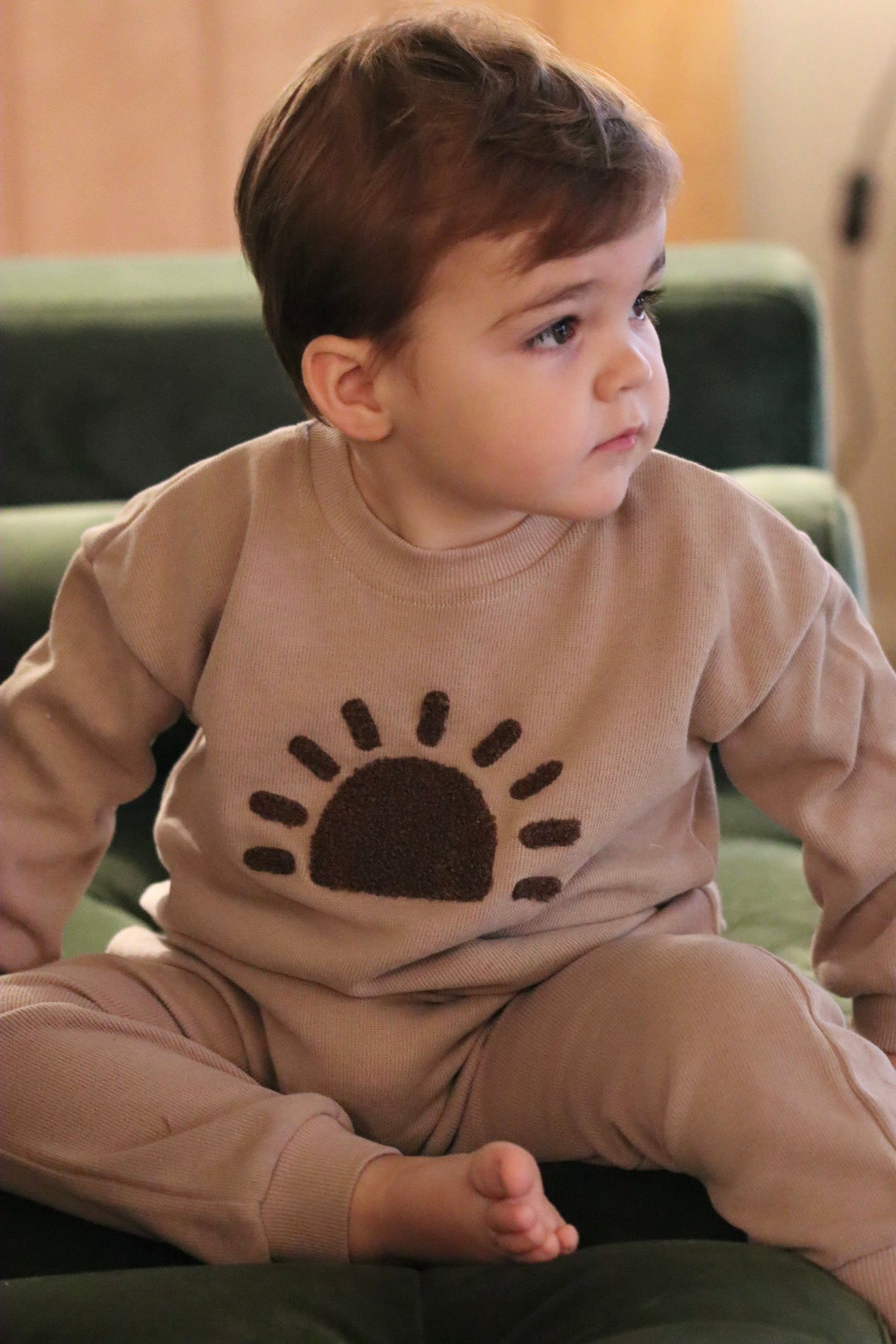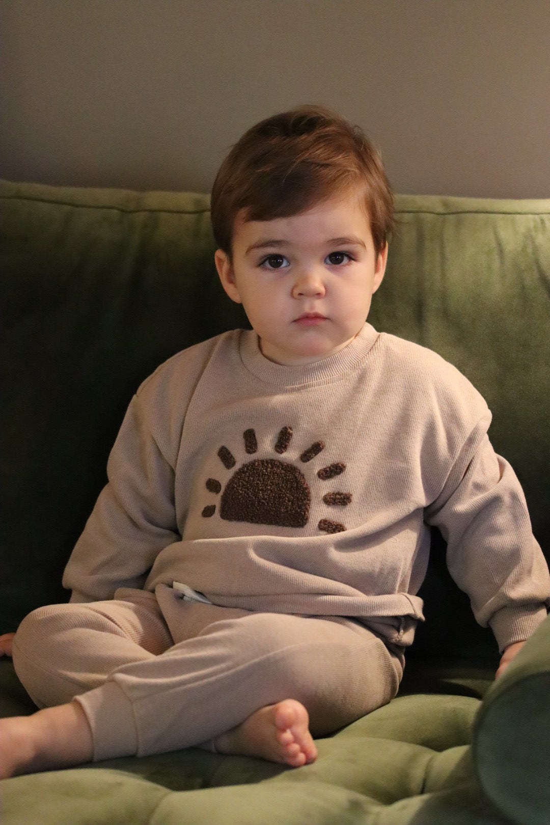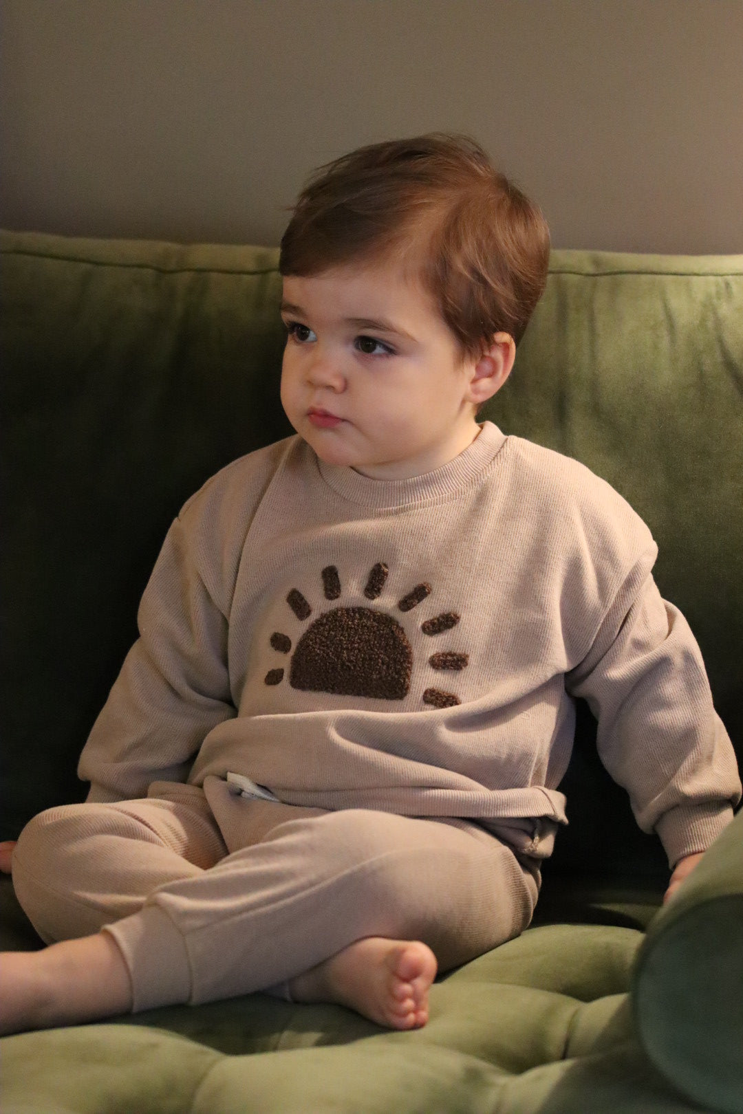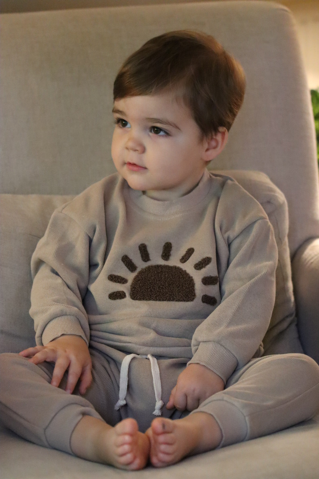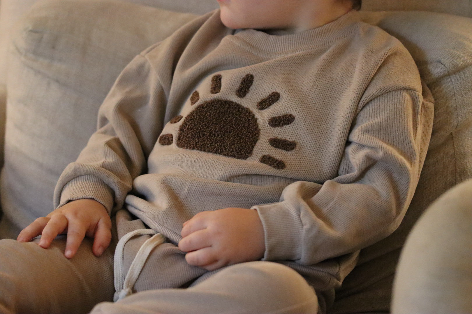 Cotton set comprising of a long sleeve top and bottoms, with sunrise detail.